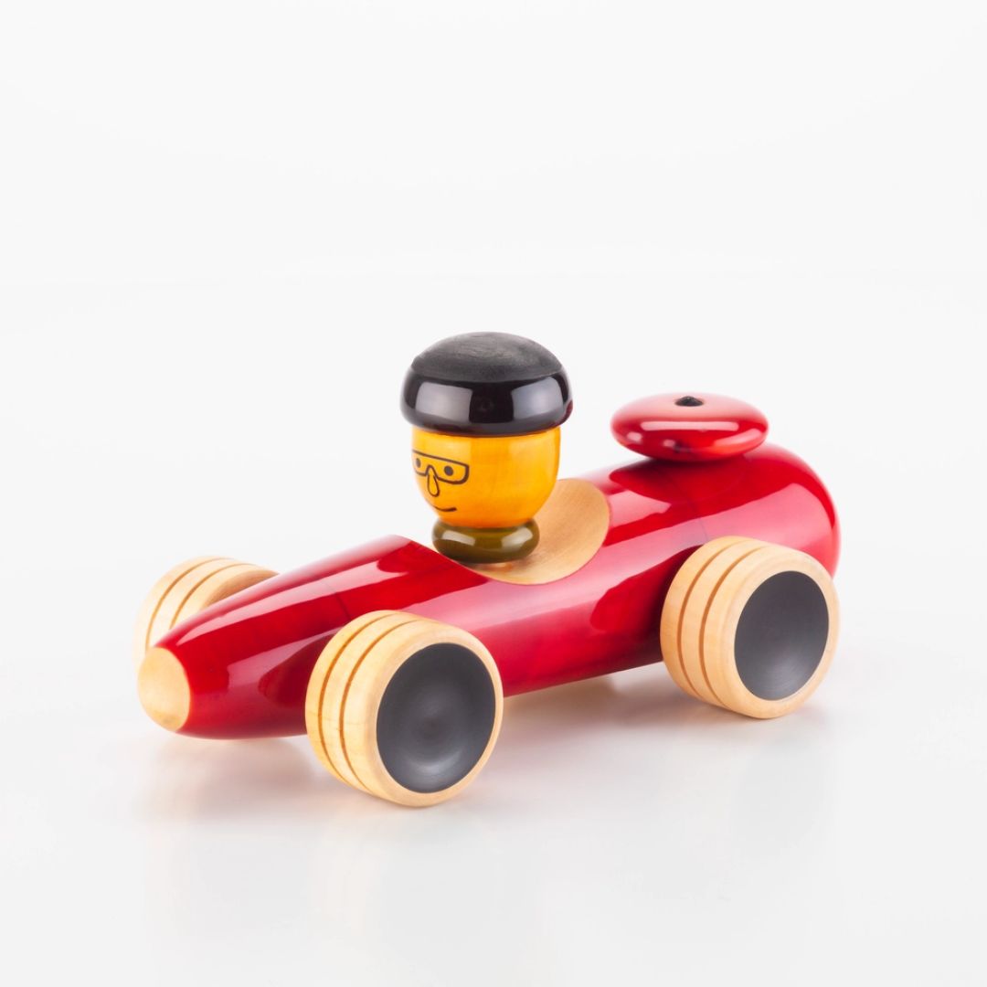 Der ca. 18 cm hohe Rennwagen von Maya Organic ist ein wunderschönes Holzspielzeug, das mühelos jedes Matchbox-Auto überholt. Die Achsen sind robust verarbeitet, ermöglichen perfektes Kurvenfahren und das Fahrzeug ist dank der chemiefreien Farbgebung umweltfreundlich und hinterlässt keine Abgase!
